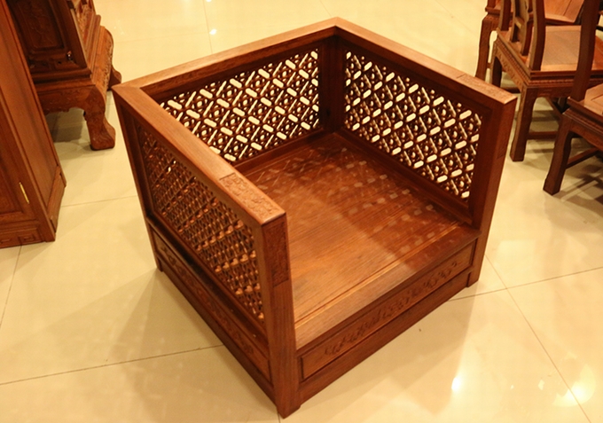 單人座沙發外觀方正匡整,兩邊扶手的高度設計的與靠背同高,而在其內外兩側均雕繪有幅闌的鏤空幾何紋飾作為點綴,彰顯著浮美淡雅的中國風式含蓄美。在沙發實際使用時,配上軟墊之后的坐感也更覺舒適,沙發座腳處地設計顯得地較為獨特,也可以說它已經將座腳處設計的概念完全融入了沙發整體,以之整體式的箱體結構作為座腳,更覺敦實、小巧玲瓏,頗有些許歐派家具式風格的韻味,實為別致。